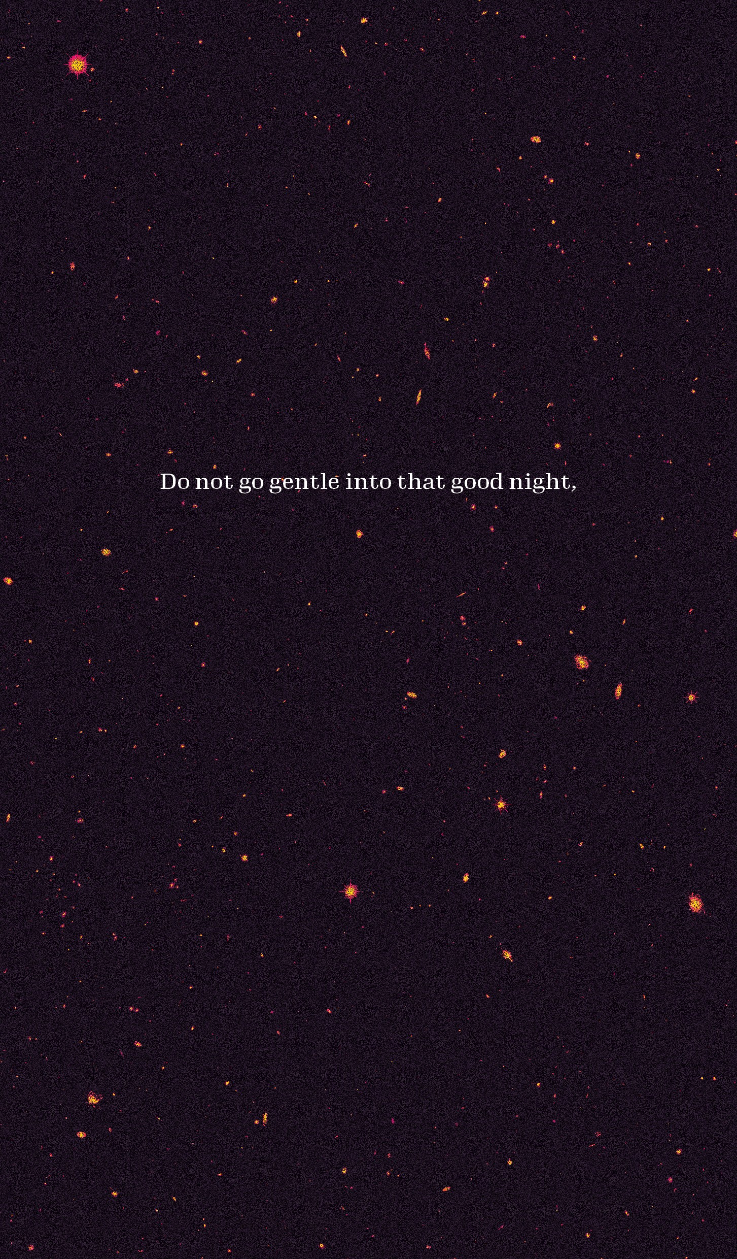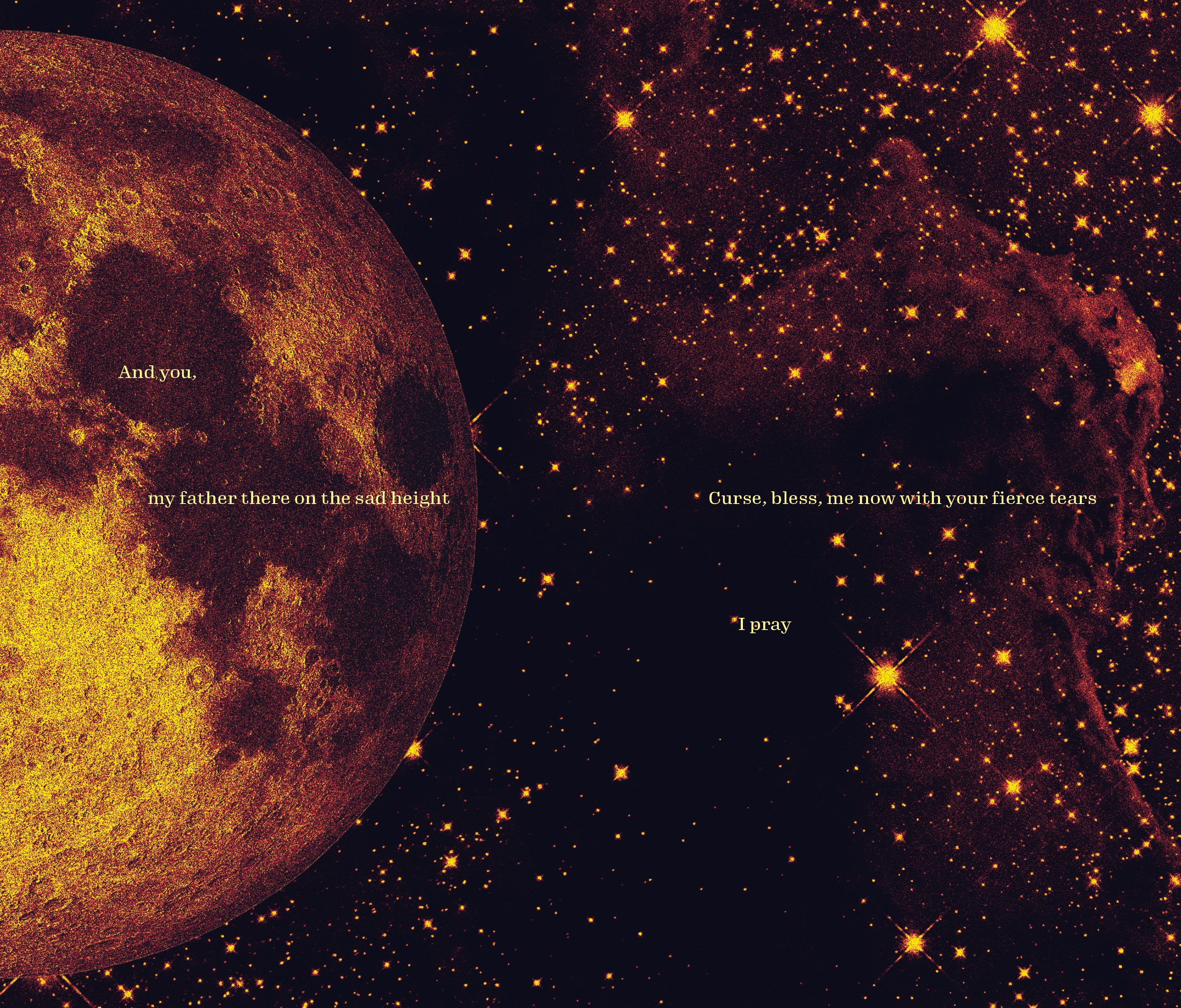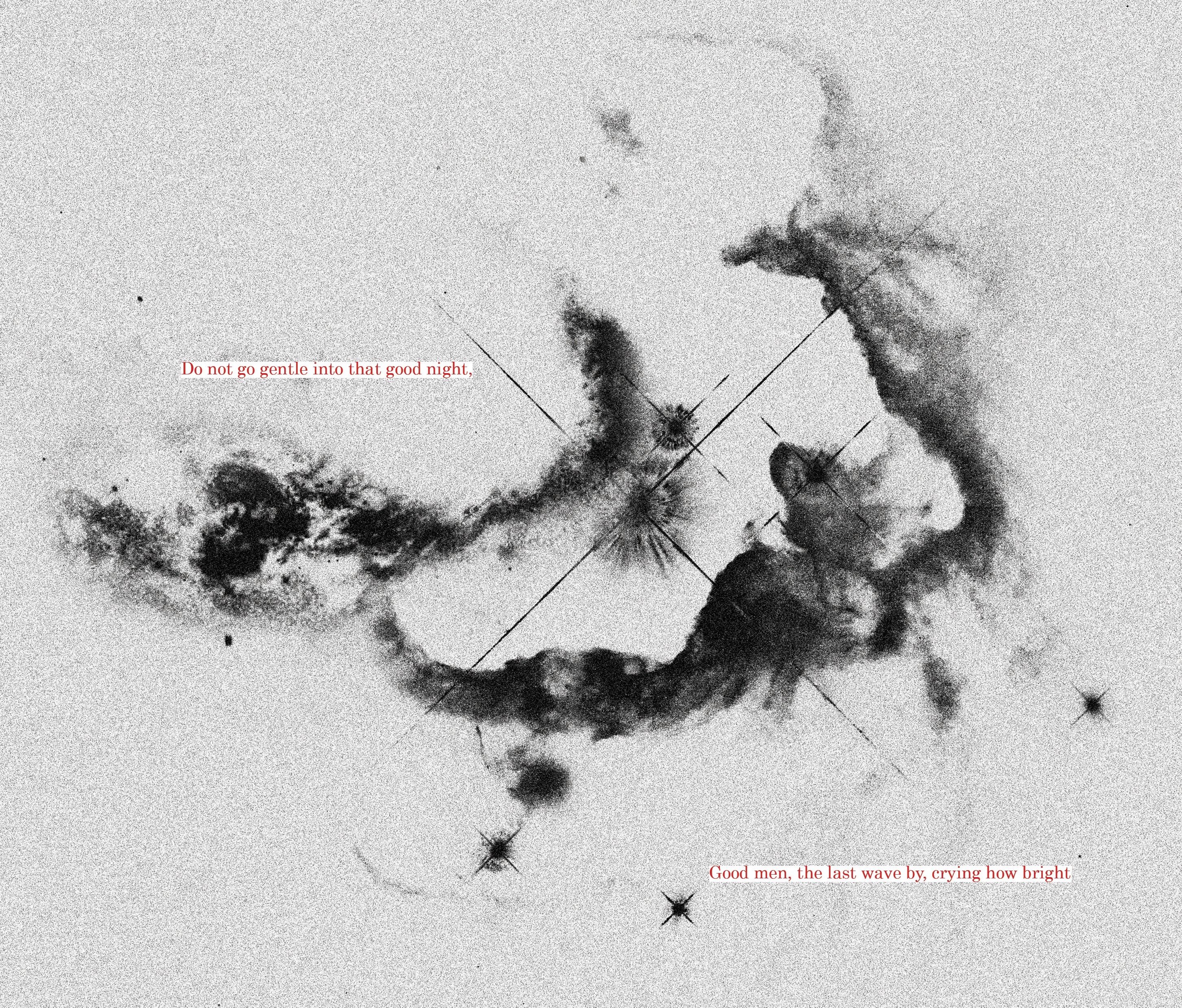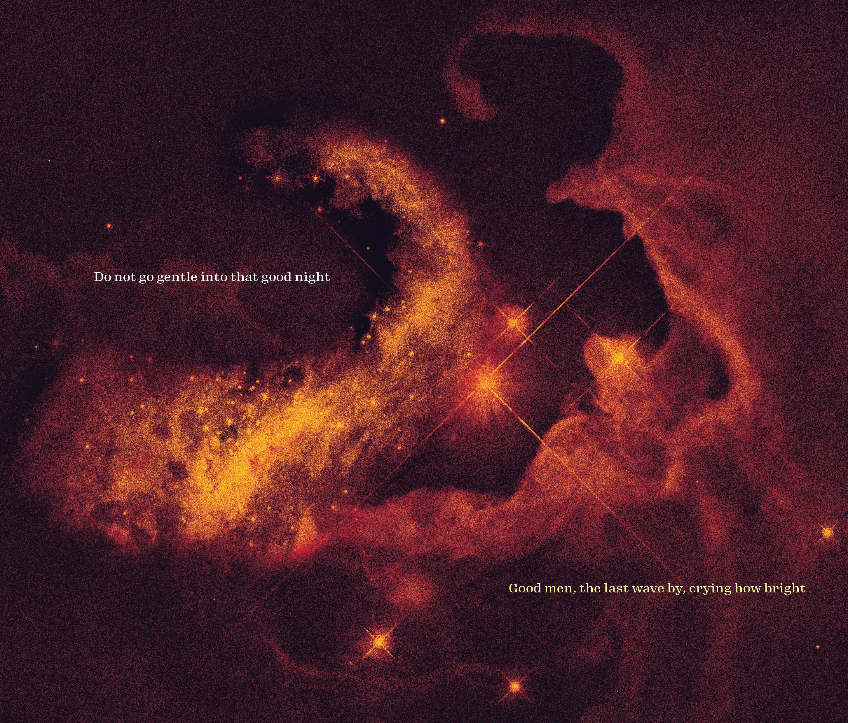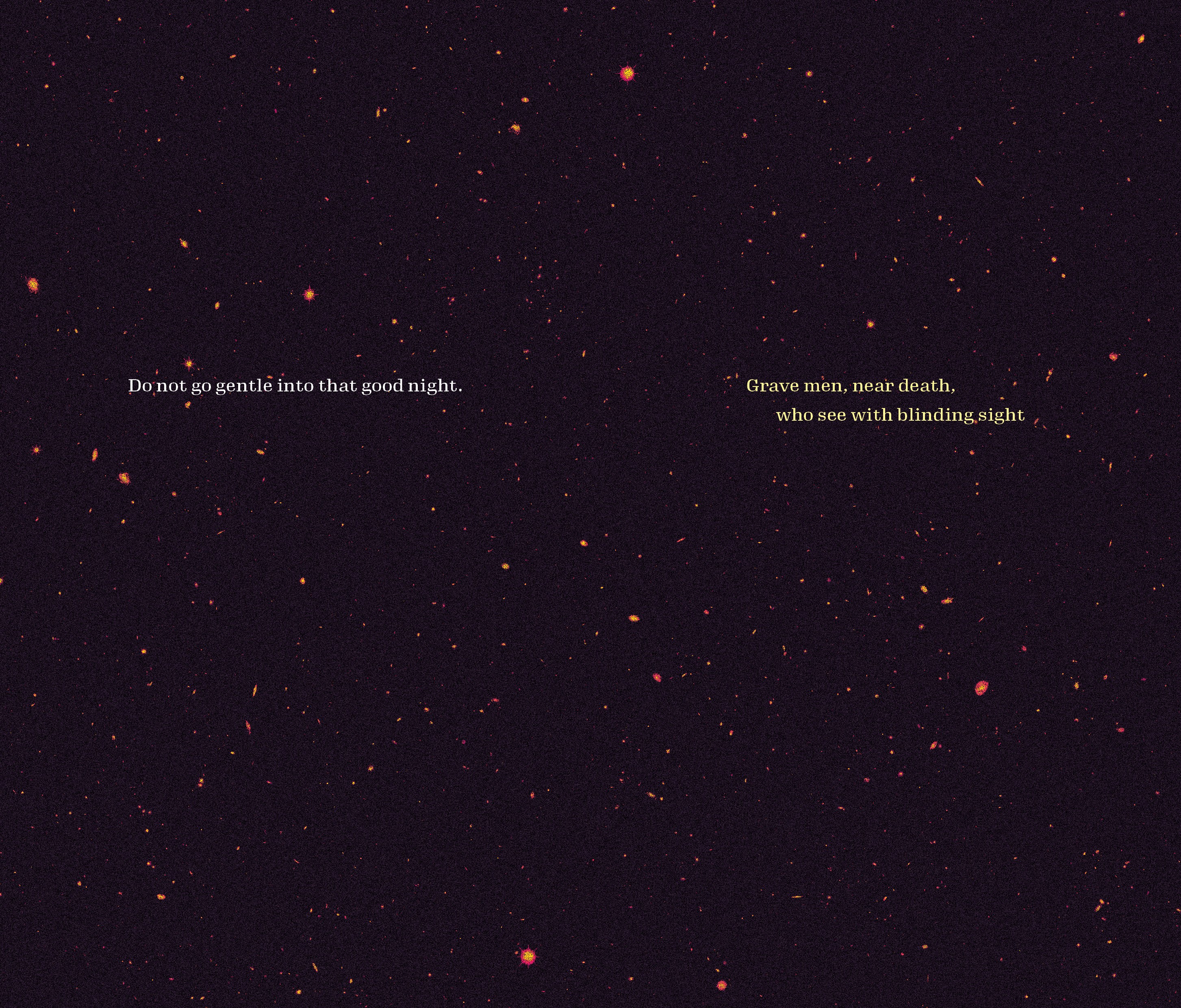 My chosen text was Do Not Go Gentle Into That Good Night (1951), a poem by Dylan Thomas which is recited in the 2014 film Interstellar. The film, primarily set in space, provides a solid visual theme with outer space imagery and deep backdrops. The text itself touches on themes of aging, and how people should fight bravely against death. The message behind the poem can match the imagery of space with symbolism linked to 'dying light' and 'night'.