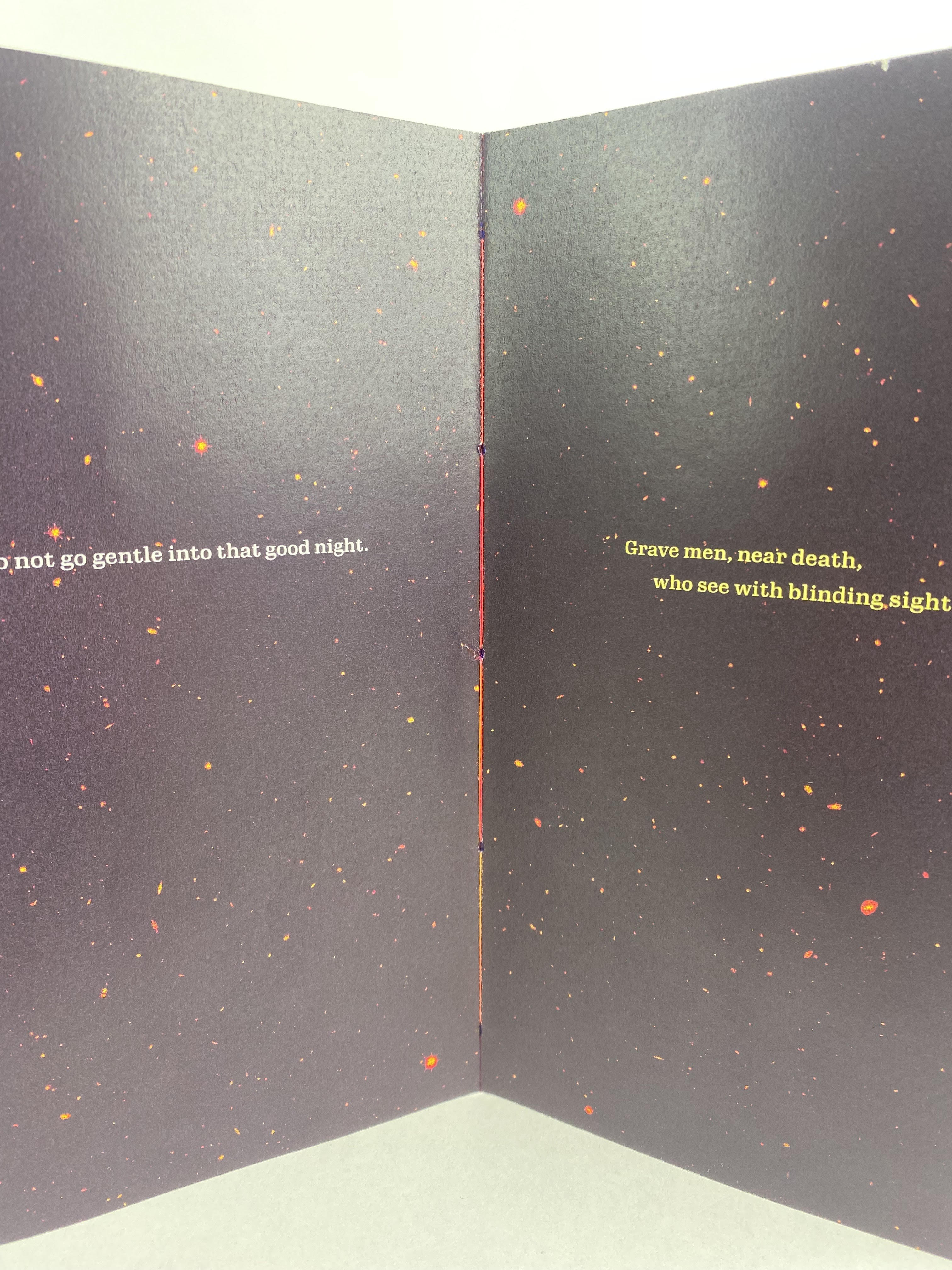 With the outer space theme behind the imagery, I was able to lean into the strong contrasts between light and dark. These ideas of light and night mentioned in the poem inspired the colour palette of dark purples and brighter oranges and yellows with pink working well as an accenting colour on both ends. I was able to create an exciting, noisy image effect to carry throughout the booklet. This added depth allowed the simple typography to pop too.
